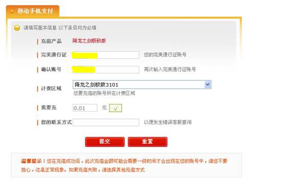 1)登录http://pay.wanmei.com/ 完美世界充值中心选择要充值的游戏产品。选择移动手机支付,输入充值账号,选择游戏区域,输入支付金额,点击移动手机支付跳转到中移动支付页面。