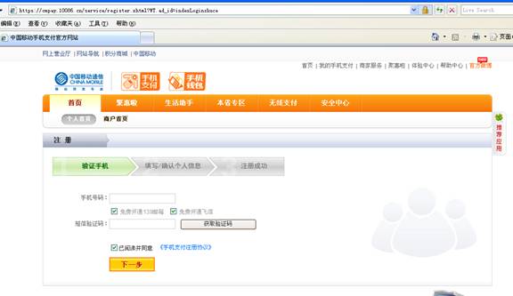 新用户输入移动手机号码和短信验证码,注册手机支付账户。