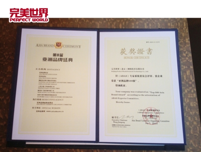 2013年9月9日,第八届亚洲品牌盛典在香港举行,完美世界荣获两项大奖——“亚洲品牌500强”和”亚洲名优品牌奖”,这是对其多年来品牌知名度及信誉度的充分肯定,同时也创下了整个游戏行业获此殊荣的先例。