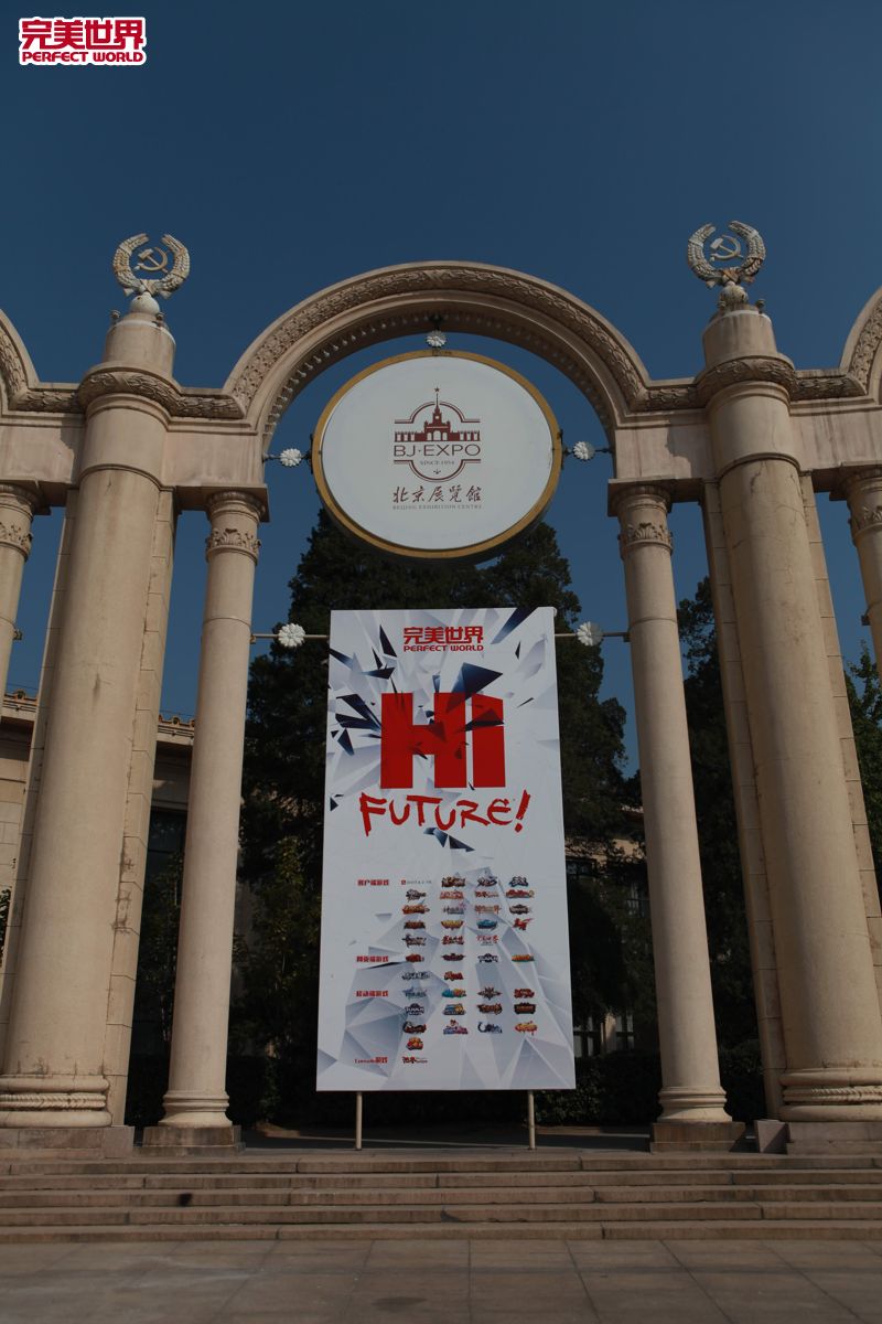 10月17日是网博会的第一天,北京展览馆人流如织。广场上人头攒动,各大公司的广告十分醒目。印着红色“Hi Future!”的白底小旗格外耀眼,夹道欢迎前来参展的玩家朋友,尽显完美世界的热情与活力。