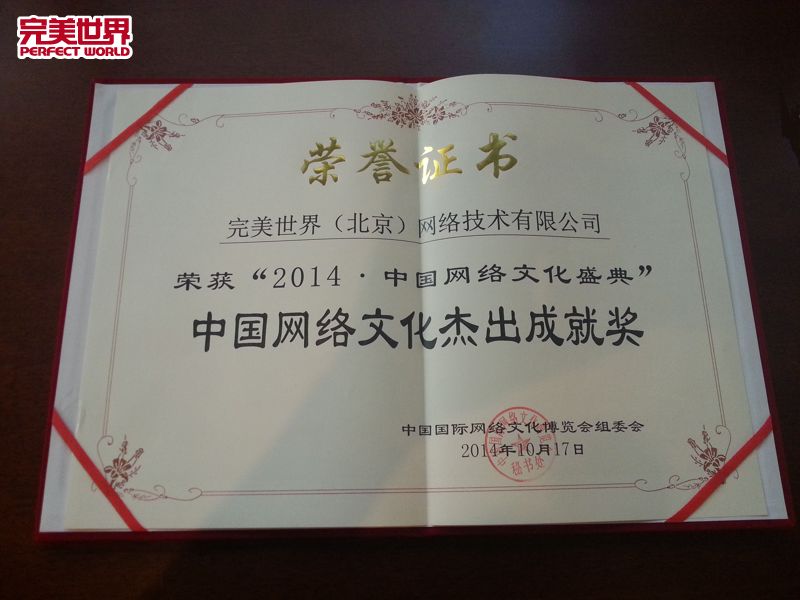 2014年10月17日下午,第十二届中国国际网络文化博览会盛大召开,网络文化颁奖盛典也如火如荼在新世纪日航酒店举行。完美世界深孚众望,三年蝉联“中国网络文化杰出成就奖”。