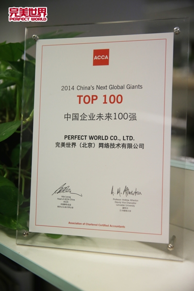完美世界获得“ACCA中国企业未来100强”的荣誉