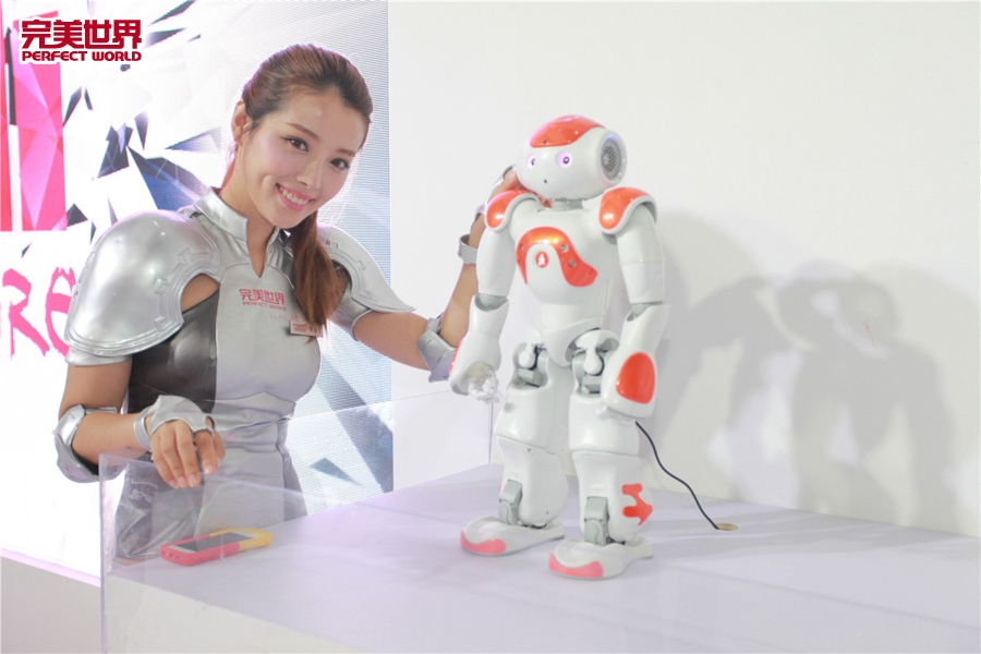 完美世界展台的活动最为引人注目的自然是大机器人K1和他的小伙伴们的表演,而旁边高挑靓丽的大模更让这个舞台增添风采。大屏上视频活动也让为了进入完美世界展台排场唱长长队伍的玩家在进入展台前激动的心情里更添乐趣。