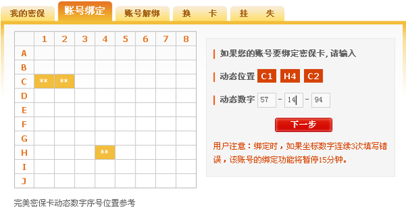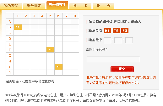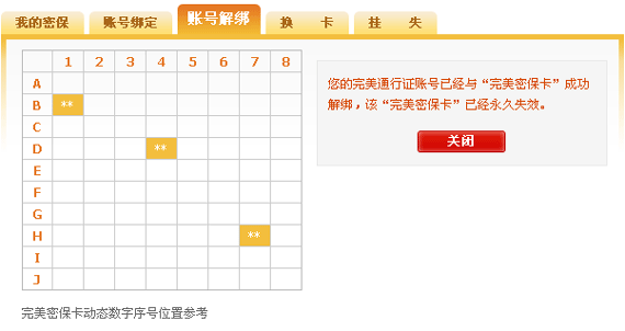 在“账号管理”页面中选择“常用功能”的“密保卡”按钮,在打开的“我的密保”页面选择“账号解绑”标签,立即解绑密保卡。按照操作提示输入账号目前正在绑定中的密保卡的序列号,并根据系统随机给的三个坐标,正确填入矩阵内对应位置处的数字。
