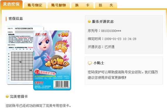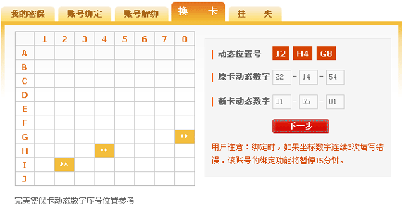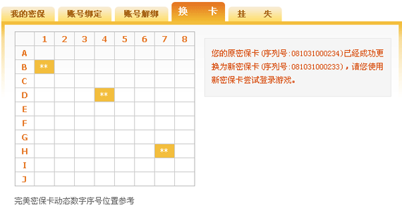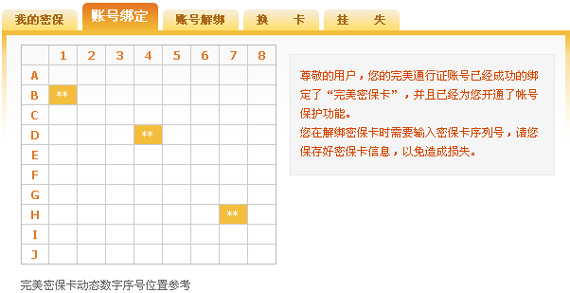 在“账号管理”页面中选择“常用功能”的“密保卡”按钮,网页上显示账号的密保卡信息: