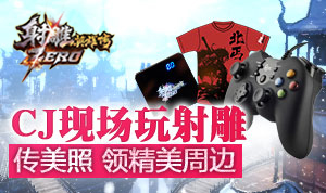 时 间 2014年7月31日—8月3日 奖 品 射雕移动电源、射雕定制手柄、五绝T恤 内 容 指定时间段亲临射雕试玩区域,即可获得射雕周边抽奖券,凭抽奖券可至ChinajoyE6馆【动漫及衍生品馆】--72-73号,免费抽取移动电源、T恤等惊喜周边。 地 点 试玩区 -