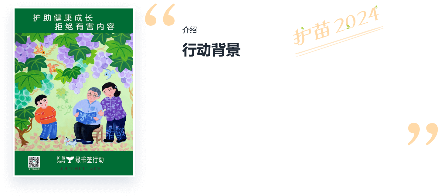 按照《2024年“扫黄打非”行动方案》部署,落实“护苗2024”专项行动要求,为大力营造全社会共同关心关爱未成年人健康成长的良好氛围,全国“扫黄打非”办公室自5月30日起组织开展2024年“绿书签行动”系列宣传活动,活动以习近平新时代中国特色社会主义思想为指导,深入学习贯彻习近平总书记关于未成年人保护、全民阅读、网络文明等的重要论述精神,以“护助健康成长拒绝有害内容”为主题,倡导绿色阅读、文明上网,增强未成年人安全意识和法治素养,提升对非法出版物及有害信息的鉴别能力和防范意识,推动全社会共同抵制涉未成年人非法出版物及有害信息,营造护助未成年人健康成长的浓厚氛围。