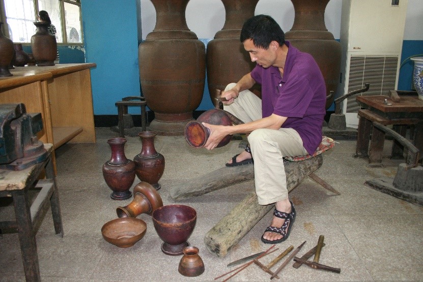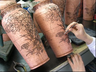 将不同规格型号的紫铜板根据造型图的要求裁剪出不同的扇形或切成不同的圆形,用铁锤将其敲打成瓶、盘、碗、罐等各种形状的铜胎。根据设计要求,有些铜胎上口底足部位还要錾出凹凸不同的图案或镂空或焊上不同的花活部件。