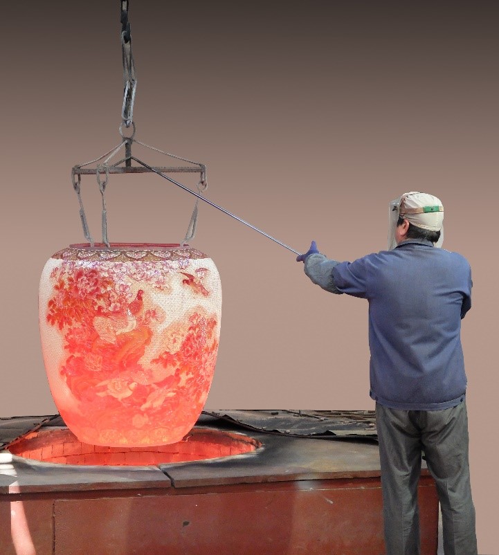 点蓝用的釉料是以石英、长石、硼砂等矿物质或多种化工原料熔炼烧制而成。点蓝艺人根据不同图案纹样的色彩要求调好釉料,用蓝枪和吸管把各种颜色的釉料填入丝间,经烧结釉料下凹,然后再点蓝再烧结,如此反复三至四遍,直至釉料与丝高度一致。
