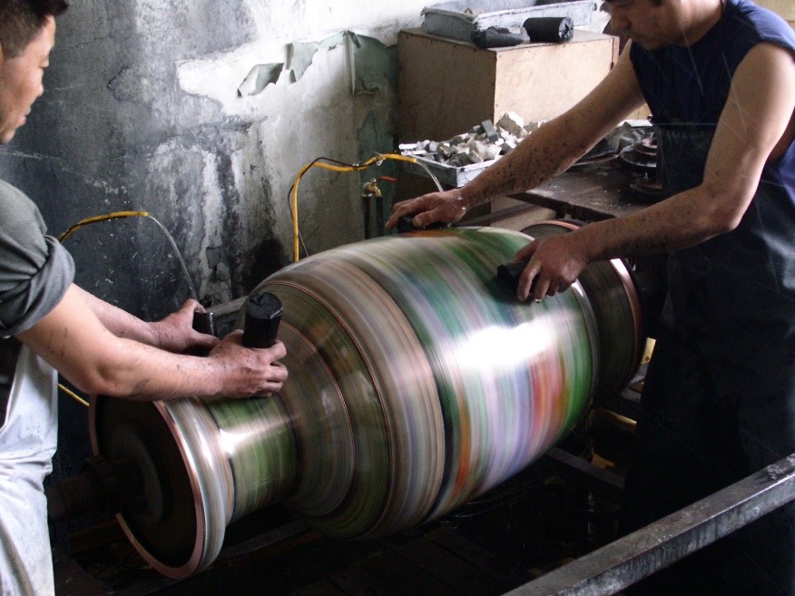 烧完蓝后,产品转入磨光工序。釉料固定在胎上,因薄厚不均,需将其磨平,使掐上的丝显露出来。先用粗砂石再用细砂石把制品表面凸出的釉料磨平,然后用黄石、椴木再细磨,直到磨出光亮。