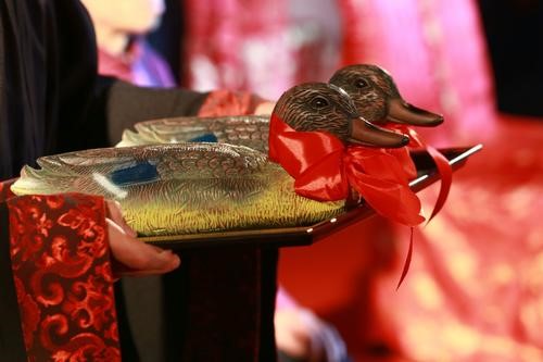 - 【明制婚礼】:宋明清时期。要经过告宗庙、催妆、束发加冠、却扇,才能拜高堂,敬天地,共饮合卺酒,才算结发礼成,是至今保留较为完整的礼仪;明制婚服,女着凤冠霞帔。
