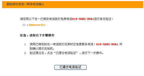 步骤四:解除绑定电话拨打010-5885-8561,听到确认提示后挂机。选择“已通过电话验证”,便可以删除掉所绑定的电话