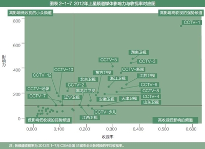 将电视频道的媒体影响力与收视率结合起来,可以将46个上星频道分为4个阵营:
