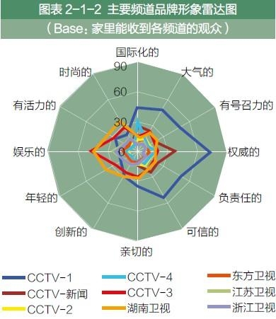 从主要频道品牌形象雷达图可以看出,重点上星频道明显分化为两个阵营,一个是CCTV-1引领的新闻阵营,给人权威的、可信的、负责任的、大气的、国际化的、有号召力的频道印象,另一个就是湖南卫视、CCTV-3引领的综艺阵营,给人娱乐的、年轻的、时尚的、有活力的、创新的、亲切的频道形象。两种阵营的分化,使得频道朝着专业化、精品化的方向发展。
