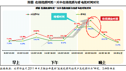 而伴随着Web2.0时代诞生的网络视频,很好的承载了网络的互动、分享、传播、聚合等各种特性,并且具备了传统的电视媒体的媒体属性,打破了以往人们在电视机前等待电视的被动接受形式,把“看电视”变成了主动、自由的行为,这也使得网络视频在出现伊始就受到广大网民的追捧和拥护。网络视频媒体的出现使得电视作为人们主要的娱乐平台的作用和功能开始退化,在网络视频用户中,看电视的时间越来越少,电视时间已经被视频时间所挤占,特别是在传统的8-10点的“黄金时间段”,看电视已经逐步退化成为在线网民的“佐餐工具”和一种有仪式感的“家庭活动”。