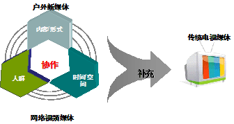 不仅如此,户外新媒体与网络视频媒体也能起到很好的协作作用。户外新型的液晶媒体在人群、时间、空间的覆盖上对网络视频也能起到很好的补充和扩大作用。与户外新媒体的协作可以作为对传统电视媒体的有力补充。在热播剧的宣传上,可以利用户外媒体平台进行节目宣传;而网络自制剧、UGC(网友上传节目)可以通过微视频的形式输出到其他媒体上进行传播,从而引发线上观看的热情;而病毒视频、视频广告可以搭载户外液晶媒体,结合户外液晶媒体扩大影响。