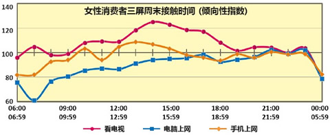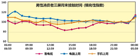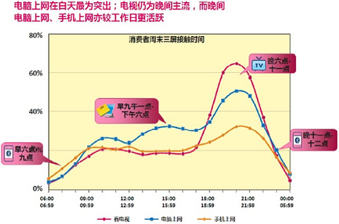 工作日,“三屏”割据使用时间段的现象非常明显。早上6点到8点,中午12点,下午5点到6点这类碎片休息时间,是活跃的手机使用时间段;白天9点到傍晚6点的工作时间段是电脑上网时区;电视依然占据晚上7点到11点的夜间休闲时间。