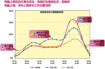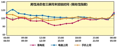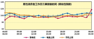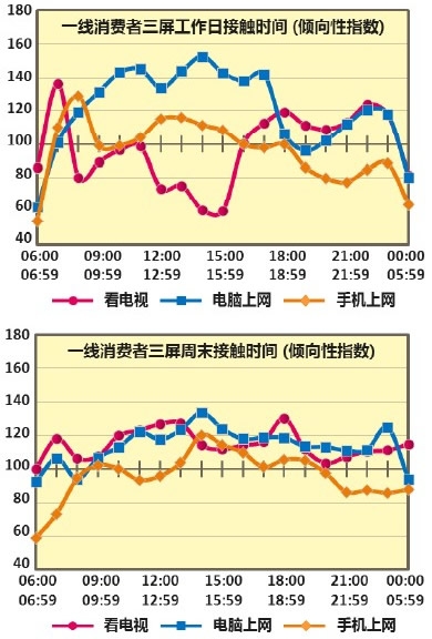 研究发现一:工作日,消费者三屏使用时间区隔明显;周末,电脑和手机的使用比例正不断蚕食电视时间。