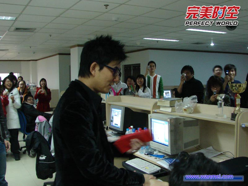 小齐此次拜访,受到包括公司董事长池宇峰在内的完美时空员工的热烈欢迎,并在公司领导的陪同下,一起参观了完美时空的新工区。小齐在感慨自己初次触电网游之余,不忘给正紧张工作的完美员工拜年,并热情的给大家派发大红包。