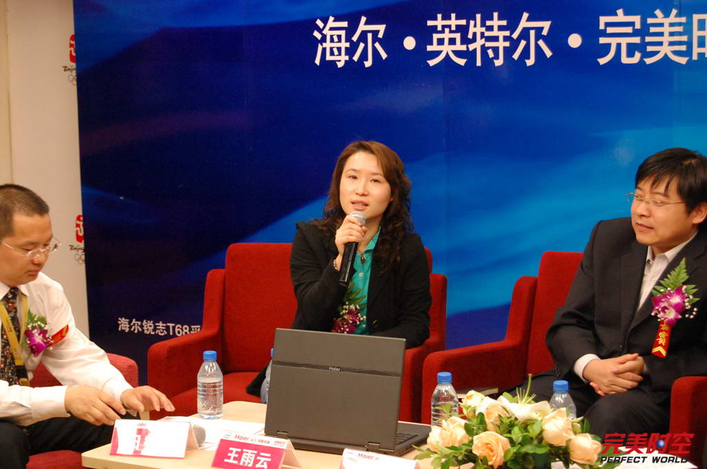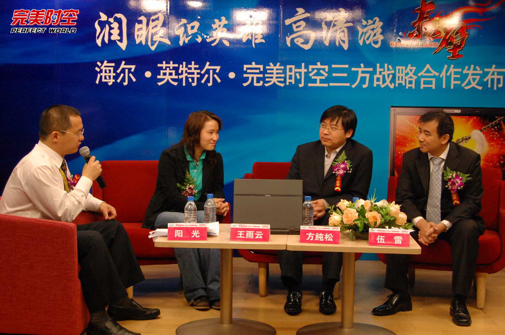 本次联合发布会由搜狐总编助理马向阳主持,出席发布会的企业领导包括完美时空副总裁王雨云女士、海尔信息科技有限公司副总裁方纯松以及英特尔公司中国区消费市场群总监伍雷。三方企业领导首先接受了媒体记者的采访,就此次三方合作的目的,宗旨以及深远的意义进行了回答,而后现场演示了基于最新英特尔迅驰处理器技术的海尔电脑展示了完美时空旗下产品《赤壁》游戏的高清晰画面,受到了到场观众的赞扬。