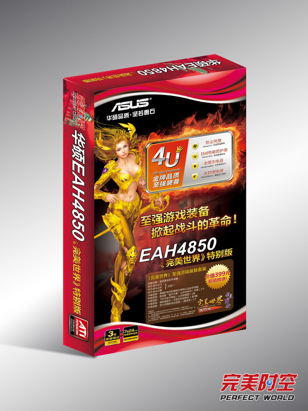 完美时空与华硕显卡的深入合作,是通过双方的核心产品得以真正实现的。华硕根据《完美世界》游戏用户的需求为他们量身订做了一款特别版显卡——“华硕EAH4850《完美世界》特别版”,此款显卡不仅游戏性能强劲,就连包装也彰显了《完美世界》特色,带给人以强烈的视觉冲击感。为了给玩家送出更大的惊喜,甚至还随显卡附赠一套价值399元的《完美世界国际版》“游戏装备套装”哦,相信得到它的玩家一定喜出望外!