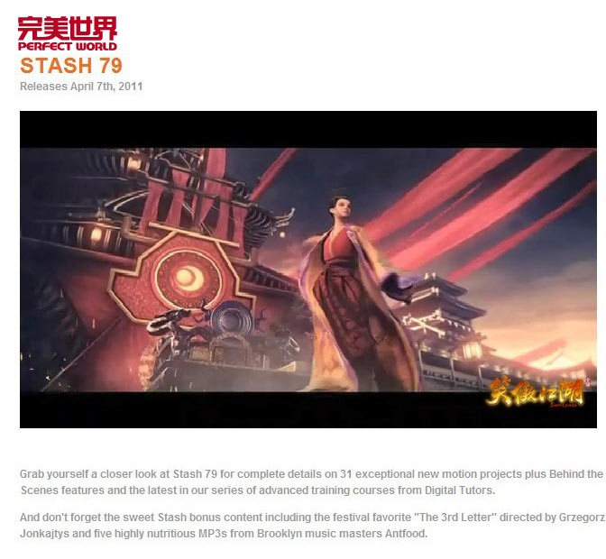 2010年,完美世界重金打造了《笑傲江湖》第二章CG“决战江湖”,自发布以来即凭借其精良的品质、动人的剧情、经典的武侠元素,得到了大家的追捧和赞赏。近日,“决战江湖”成功入选并且荣登世界顶级动画杂志《STASH DVD》第79期,并与《星际争霸II》、《指环王》、《阿凡达》共同被列入“顶级视觉特效名人堂”。这是《笑傲江湖》CG继参展法国动画节之后,荣获的又一项国际殊荣。