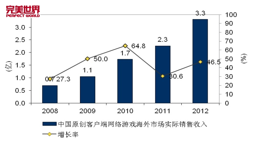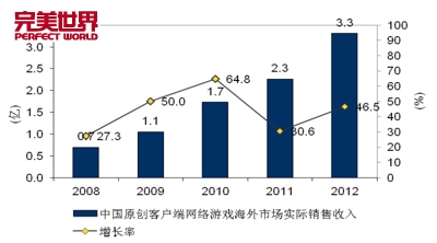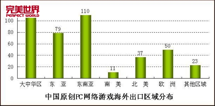 其中,报告显示,仅2012年,就有40家中国企业自主研发的177款网络游戏进入海外市场。完美世界作为领先的网游开发商和运营商,因优越的海外出口模式和文化输出成就等备受肯定。2012年,在以完美世界为代表的企业努力下,“中国自主研发网游出口地区持续增加,除亚洲、欧洲、非洲、北美洲等地区外,中国网游对俄罗斯以及南美地区的市场开发力度持续增强。”