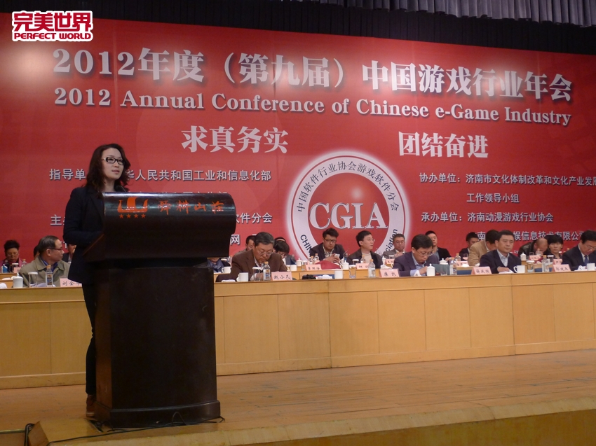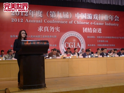 2013年3月23日,2012年度中国游戏行业年会于山东隆重召开。政府领导与来自全国的动漫优秀企业及个人、行业主流媒体齐聚一堂,对过去一年的行业发展情况做出总结,对未来的发展方向做出展望,与此同时,游戏行业内含金量最高的荣誉奖项之一——金手指奖正式揭开神秘面纱。作为最具实力角逐金手指最高奖项的游戏企业之一,完美世界对历届游戏行业年会都给予了高度重视。今年,完美世界副总裁兼官方发言人王雨云女士亲临年会现场,就中国网游在海外的发展现状作出了总结,并以完美世界为例,深度诠释了游戏公司在海外拓展中,所持有的三个必要条件。此后,王雨云女士代表完美世界领回了沉甸甸的荣誉。