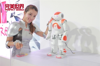 完美世界展台的大机器人K1是玩家最爱