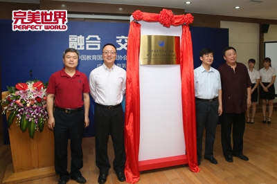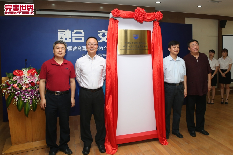 中国教育国际交流协会教育与文化创意产业分会成立。自左至右为文创分会理事长、中国传媒大学副校长廖祥忠,文创分会副理事长、完美世界(北京)网络技术有限公司首席执行官萧泓博士,中国教育国际交流协会秘书长生建学,文创分会副理事长、北京联盟影业董事长郝亚宁。