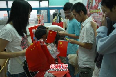 由于我国四川灾区仍处于十分困难的阶段,本站活动延续了爱心主题。参加虚拟营销的同学自发写出“支援灾区,抗震救灾”的标语,用自己的行动,向灾区人民表达自己的一片爱心。另外,活动主办方还新增了小国旗作为赠品,发放给参加互动的同学。而这也寄托了主办方和同学们心系灾区,为灾区祝福、为祖国加油的心情。白天的活动现场,处处体现着完美时空与同学们对灾区的一片真情。