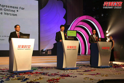 “红颜已远,往事不堪回首。相思犹存,慧剑斩断情丝。”在大屏幕中闪现,《诛仙》掌门人任贤齐随着渐渐亮起的灯光走舞台,一曲《诛仙我回来》将《诛仙》游戏中的爱恨情仇表达的淋漓尽致,也将现场来宾的热情推向最高点,“完美最佳奇缘情侣”、“完美最具人气公会”、“完美最具实力公会”及特别奖“完美最具凝聚力公会”等四项公会类奖项借由小齐之手颁发。同时,完美时空CEO池宇峰先生与台湾智冠科技有限公司及日本C&C Media公司进行现场的电子签约,就《诛仙》在中国台湾和日本两地的出口运营达成一致。最后,本次颁奖典礼也在欢快的气氛中落下帷幕。