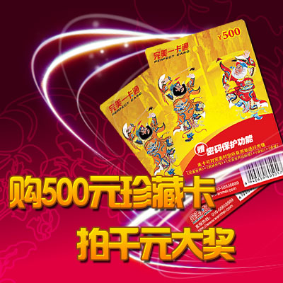 本次活动的500元面值2008完美珍藏版一卡通将在全国范围内进行发行,并且为极其珍贵的限量版。除了实用效果外,还可便于玩家作珍藏所用,其价值可谓 非凡。无论你是完美时空的铁杆玩家,或是珍贵游戏收藏品的爱好者,又或者急需完美一卡通进行充值,那么这次限量发行的完美珍藏版一卡通都会是你的珍贵之 选。