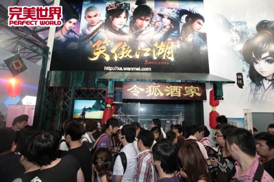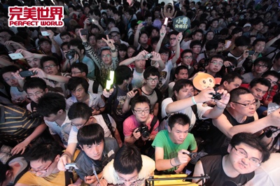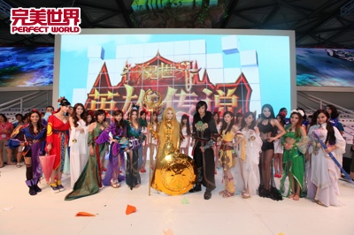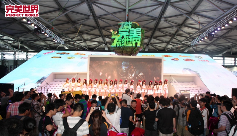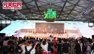 在完美展台,让玩家兴奋不已的还不仅仅如此,完美世界的娱乐表现也相当精彩。不但有清纯ShowGirl、热辣大模、神秘Coser的精彩表演,而且还有少女Lunar和青空乐队的卖力演出,在美女帅哥如云的ChinaJoy现场,完美世界依然是最受关注的人气展台之一。