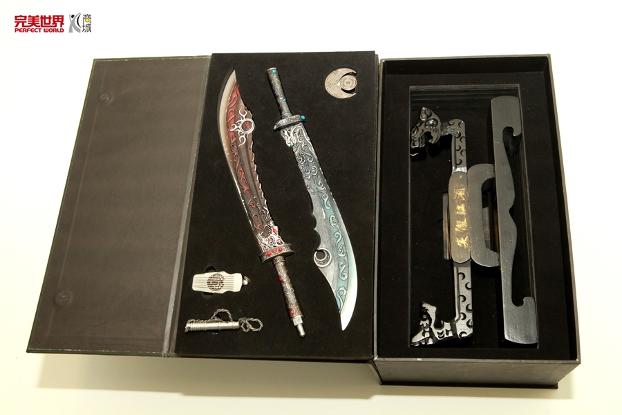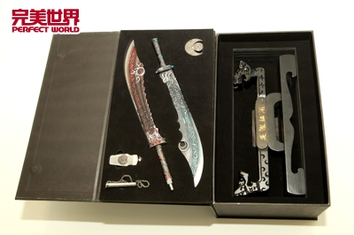 据悉,豪华礼包的策划与制作工作早在4个月前便开始了筹划,礼包内总共包含“日月双刀合金模型”、“日月教纹章16G U盘”、“琴箫项链”、“专用展示刀架”、“典藏卡”四件实物周边。其中日月双刀模型作为豪华礼包的主打卖点真实地还原了游戏原画设定中武器上的风貌。为了真实地再现双刀的每一个细节,在材质及用料上可谓不计血本。两把双刀采用了全合金材质打造,刀身上的宝石选用了纯天然宝石进行精确地切割与镶嵌,并且通过刀柄的特殊设计,完美地还原了双刀合璧形态。实乃武侠爱好者梦寐以求的经典藏品。日月教纹章U盘选用了16G的优质芯片精心打造,为了方便玩家,在U盘内还包含了《笑傲江湖OL》的公测客户端。