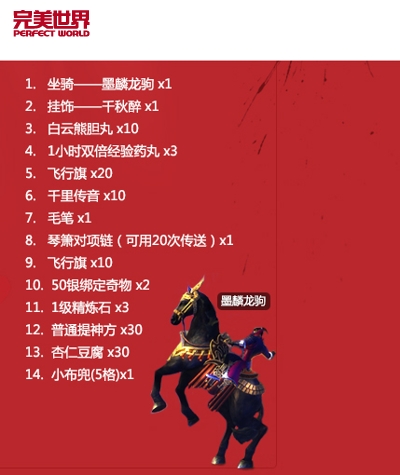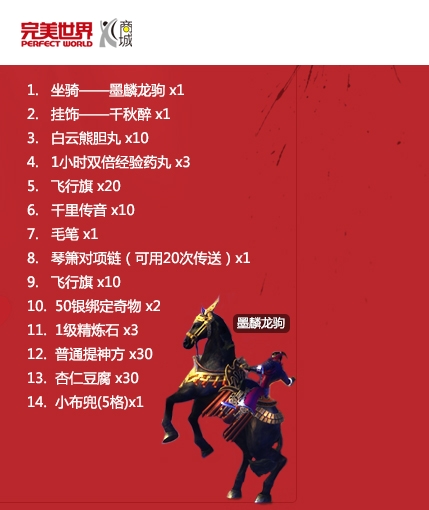 豪华礼包中的虚拟物品也同实物周边一样引人瞩目。本礼包中包含两件获取途径唯一的超强物品——“坐骑墨麟龙驹”和“挂饰千秋醉”,这两件物品在游戏中拥有独一无二的特殊外观,是彰显尊贵身份的不二选择。除此之外,琴箫项链的双人传送以及白云熊胆丸等实用道具也会极大程度的为玩家在游戏中提供便利。