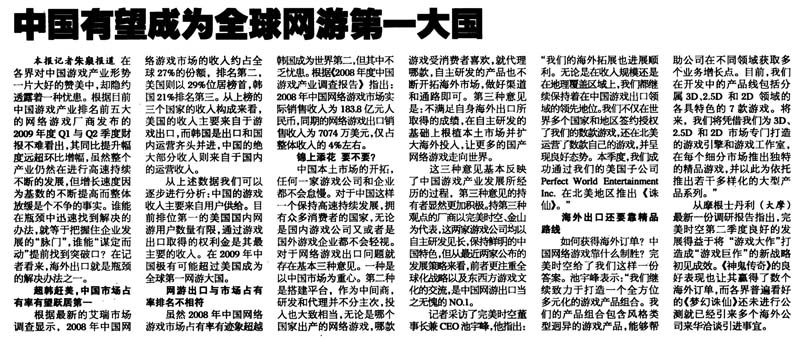 记者采访了完美时空董事长兼CEO池宇峰,他指出:“我们的海外拓展也进展顺利。无论是在收入规模还是在地理覆盖区域上,我们都继续保持着在中国游戏出口领域的领先地位。我们不仅在世界多个国家和地区签约授权了我们的数款游戏,还在北美运营了数款自己的游戏,并呈现良好态势。本季度,我们成功通过我们的美国子公司PerfectWorldEntertainmentInc.在北美地区推出《诛仙》。”