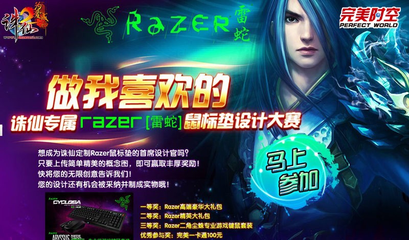 想成为《诛仙2》专属Razer鼠标垫的首席设计官吗?只要上传简单的概念图,即可赢取Razer专业游戏鼠标、键盘、游戏点卡等丰厚奖励!快来秀出你的创意!你的设计还有机会被采纳并制成实物哦!