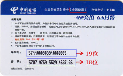 电信地方卡:19位卡号,18位密码(上海、江苏、广东地区)卡号第四位是2,支持面额50元,100元。