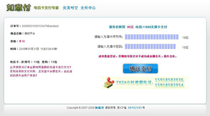 (2)进入电信购卡的支付页面—如意付支付中心,您尽量在5分钟之内完成支付,否则订单将失效,您要重新进入购卡中心选择电信卡充值方式!
