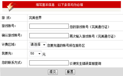 (3)进入电信卡的充值页面后,输入游戏账号信息,账号区域,充值的金额,以及您的联系方式后提交;