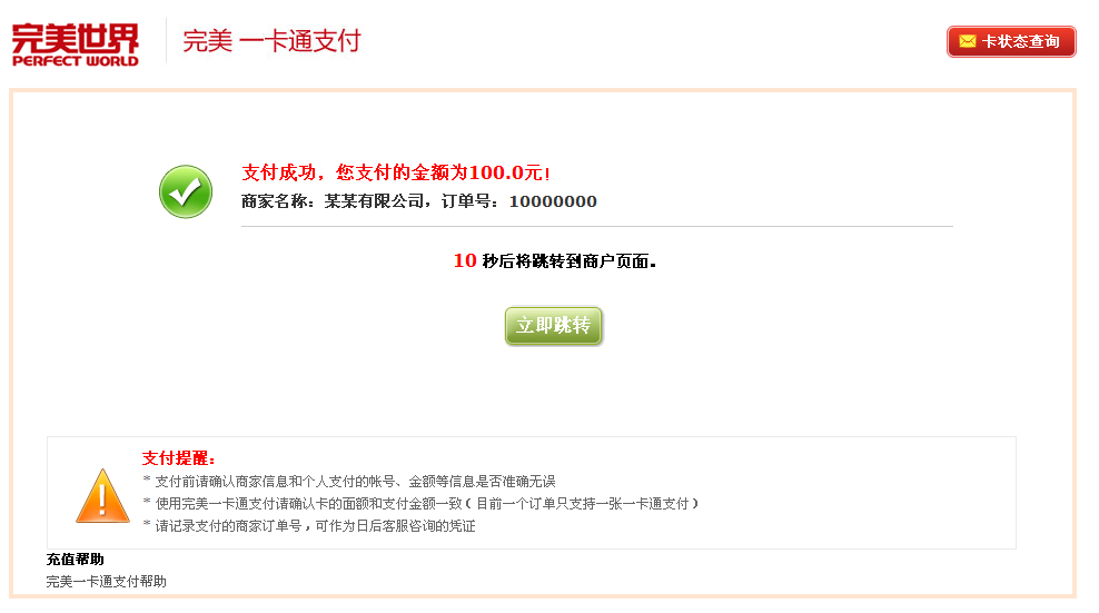 用户在商家购物时选择完美一卡通支付后,进入完美一卡通支付页面: