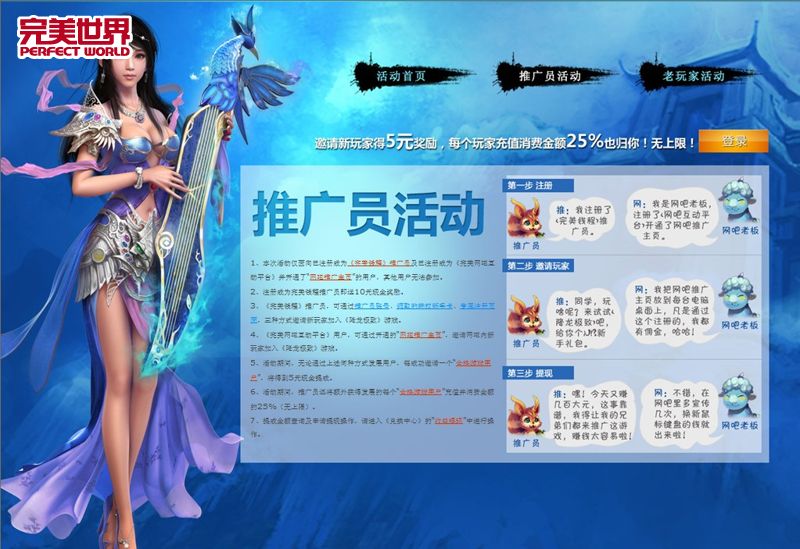 已注册成为《完美网吧互动平台》并开通了"网吧推广主页"的用户,也可参加《修罗刹》"完美钱程"活动,注册推广员赚现金。
