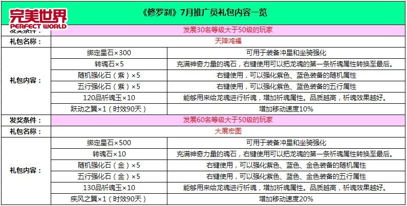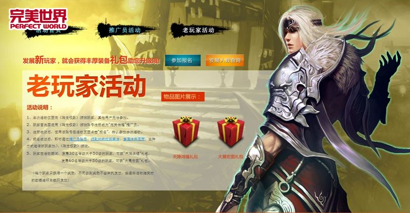 本次活动,《修罗刹》老玩家可使用游戏账号注册成为游戏推广员。注册成功后,使用该账号在活动页面点击"报名",确认参加本次活动。除了和新用户注册的推广员一样享有推广游戏赚现金的分红以外,老玩家每发展30名等级大于50级的玩家,可获"天降洪福"礼包;发展60名等级大于50级的玩家,可获"大展宏图"礼包。
