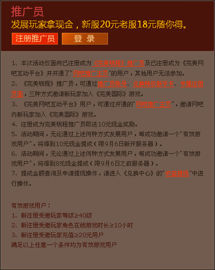 该活动针对所有已注册成为《完美钱程》推广员及已注册成为《完美网吧互动平台》并开通了“网吧推广主页”的用户:前者可通过推广员账号、兑换特权新手卡、专属注册页面,三种方式进行推广,邀请新玩家加入《完美国际》;后者可通过开通的“网吧推广主页”,邀请网吧内新玩家加入游戏。无论通过何种方式,只要成功邀请到“有效游戏用户”就可获得现金奖励。