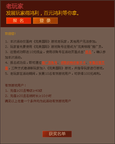 此活动活动仅面向《完美国际》游戏老玩家。玩家首先需要注册成为“完美钱程”推广员,注册成功就能获得现金奖励,然后点击“报名”参加本次活动,并通过推广员账号、领取的特权新手卡、专属注册页面,三种方式邀请新玩家加入,并指导玩家进行游戏,最终通过邀请到的“有效游戏用户”个数进行奖励分配。