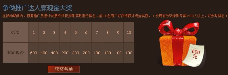 最终会统计所有推广信息,在活动期间内,根据推广员累计发展有效玩家帐号数进行排名,前10名用户可获得额外现金奖励。(注:发展有效玩家帐号数≥20人以上,可参与排名)
