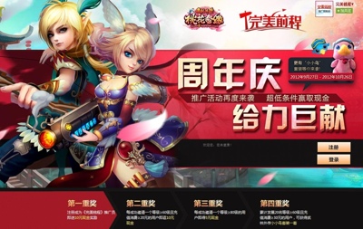 2012年9月27日-10月26日,《武林外传·桃花奇缘》六周年给力巨献,推广活动再次来袭,超低条件赢取现金,更有价值300元的周边小小鸟套装奉送,轻轻松松让你身价百倍,“钱”程无忧。