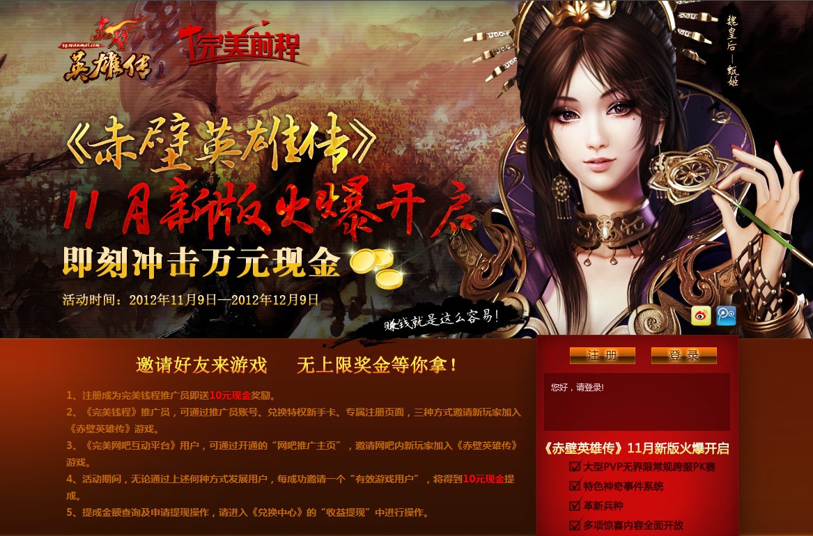 无论你是从未认识赤壁的新玩家,还是正在兴致勃勃开玩的老玩家,只要登陆“《赤壁英雄传》完美钱程” 活动页面,注册成为完美钱程推广员即送10元现金奖励。