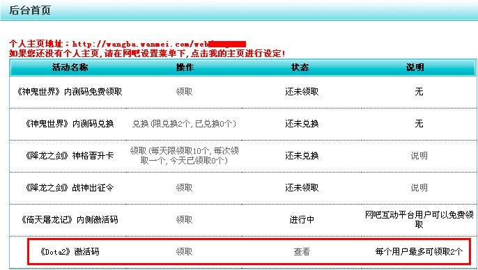 网吧业主申请加入《完美网吧互动平台》(http://wangba.wanmei.com/),通过审核成为《网吧互动平台》用户后,即可登录网吧互动平台后台领取DOTA2激活码。